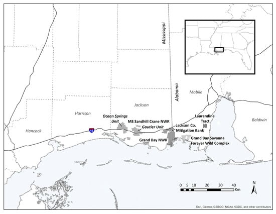 We modeled the potential distribution of yellow rail along the East Gulf Coastal Plain in Mississippi (Harrison, Hancock, and Jackson Counties) and Alabama (Mobile County; Figure 1). These areas are characterized by low topography and infertile, acidic clay soils that often remain saturated [32], and have a temperate climate with hot summers and mild wet winters [33]. The study area contains some of the largest remaining fragments of wet pine savanna including: Grand Bay Savanna Forever Wild Complex, Alabama; the Grand Bay National Wildlife Refuge (NWR)/National Estuarine Research Reserve, and the Mississippi Sandhill Crane NWR, Mississippi [34].