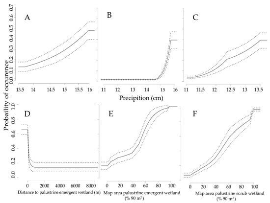 Response curves for environmental variables modeled in MaxEnt for the predicted distribution of yellow rail (Coturnicops noveboracensis) in Alabama and Mississippi, USA. (A) shows response to precipitation in June; (B) response to precipitation in August; (C) response to precipitation in September; (D) response to distance to palustrine emergent wetland; (E) response to unit of mapped area of palustrine emergent wetland (per map cell of 90 m2); (F) response to unit of mapped area of palustrine scrub wetland (per map cell of 90 m2). Dashed lines reflect two standard deviations of estimates.