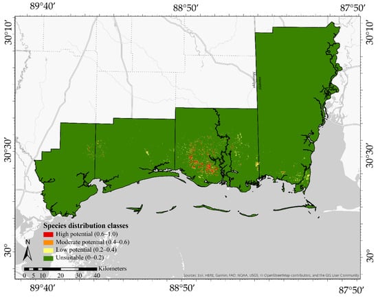 Large-scale conditional changes can affect the ability to maintain ecosystems in historic contexts with respect to localized management [16,60,61]. Although our suitability predictions are specific to current conditions, and while conservation mandates persist on public lands such as the Mississippi Sandhill Crane NWR and the Grand Bay Savanna Forever Wild Complex, etc., our predictive HSM provides new opportunities to strategically identify and approach other stakeholders to expand conservation stewardship within the northern Gulf-coast region. Such efforts would also benefit the entire suite of floral and faunal species associated with coastal wet pine savanna ecosystems.