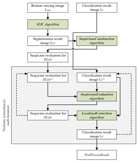 Based on the four steps and algorithms described in the preceding subsection, we can evaluate the classification result image without requiring testing samples and correct the classification result image within local areas. By integrating these algorithms, we propose an end-to-end and localized post-processing method (ELP) whose input is a remote sensing image Iimage and a classification result image Icls, and whose output is the corrected classification result image. Through the iterative and progressive correction process, the goal of improving the quality of the ICLS can be achieved. The process of ELP is shown in Figure 3.