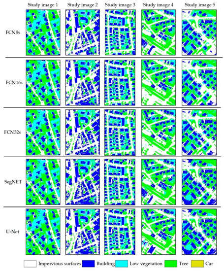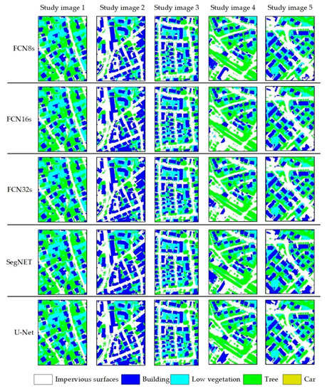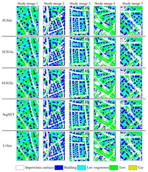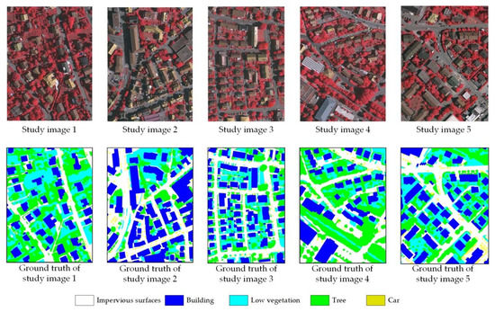 All five images contain five categories: impervious surfaces (I), buildings (B), low vegetation (LV), trees (T), and cars (C). These images have three spatial bands (near-infrared (NIR), red (R), and green (G)). The study images and their corresponding ground truth images are shown in Figure 4.