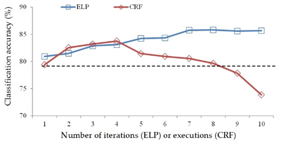 In Figure 7, the black dashed line indicates the original classification accuracy of 79.02%. The CRF’s accuracy improvement was slightly better than that of the ELP algorithm in the second, third, and fourth iterations; however, its classification accuracy decreases rapidly in the later iterations, and by the ninth iteration, the classification accuracy is lower than that of the original classification result image. In contrast, the classification accuracy of the ELP increases steadily, and after approaching its highest accuracy, in subsequent iterations the accuracy remains relatively stable. From the above results, the ELP not only achieves a better correction result but also avoids causing obvious classification accuracy reductions from performing too many iterations. In end-to-end application scenarios where no samples participate in the result evaluation, we cannot know when the highest correction result has been reached; thus, the ideal method of termination conditions are also unknown. Specifying a too-small distance parameter will cause under-correction, while a too-large parameter will cause over-correction. The relatively stable characteristics and greater accuracy of ELP clearly allow it to achieve better processing results than those of CRF.