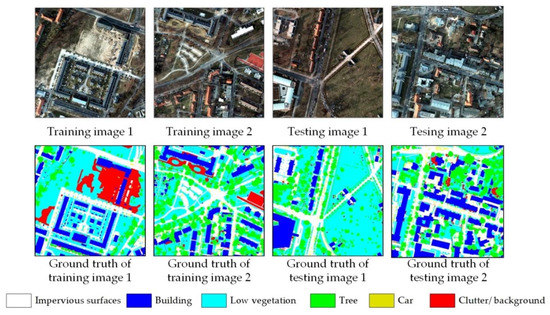 We selected two images as training data and the other two images as test data. Three bands (red (R), green (G), blue (B)) of images were selected. These images contain six categories: impervious surfaces (I), buildings (B), low vegetation (LV), trees (T), cars (C), and clutter/ background (C/B). The study images and their corresponding ground truth images are shown in Figure 10.