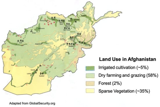 - Central Intelligence Agency. Afghanistan Land Use. The World Factbook. Available online: https://www.cia.gov/library/publications/resources/the-world-factbook/geos/af.html (accessed on 7 December 2019).
