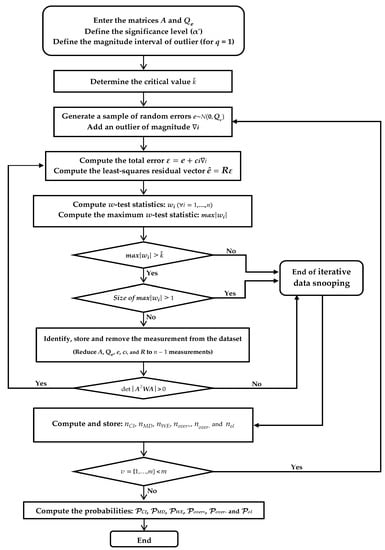 In the previous section, probability levels are described for the case in which the data snooping procedure is applied only once according to the detector given by Equation (16). In practice, however, data snooping is applied iteratively: after identification and elimination of a single outlier, the model is reprocessed, and outlier identification is restarted. This procedure of iterative outlier elimination is known as iterative data snooping (IDS) []. Therefore, IDS is not only a case of multiple hypothesis testing but also a case of multiple runs of estimation, testing and adaptation. In that case, adaptation consists of removing a possible outlier.