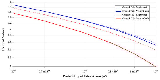 Here, the critical value is computed by Monte Carlo such that a user-defined Type I decision error for IDS is warranted. In other words, the Type I decision error is effectively user-controlled when both the functional and stochastic parts of the model are taken into account. To do so, we employ the Monte Carlo method because the critical region of the test statistic associated with IDS is too complicated. The critical region is the subset of the measurements for which the null hypothesis is rejected []. Therefore, the false alarm rate can be user-controlled by setting the appropriate size of the critical region.