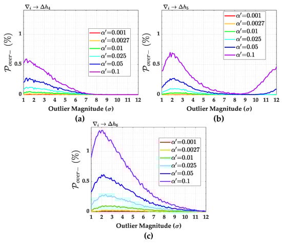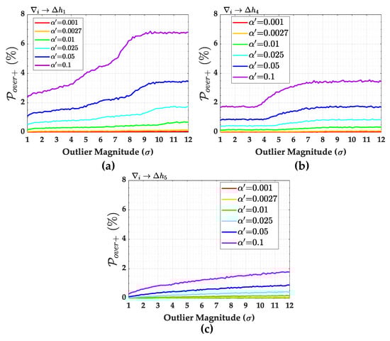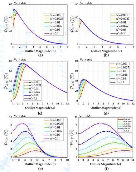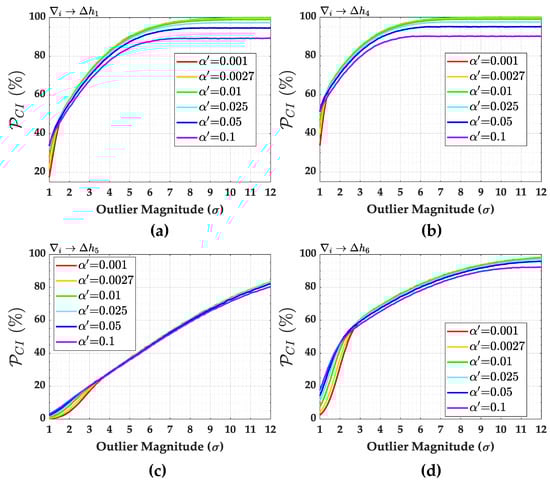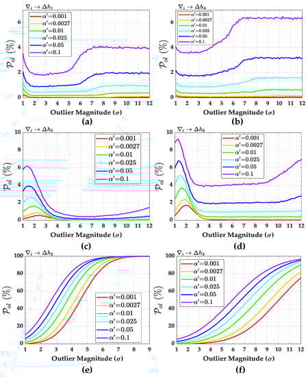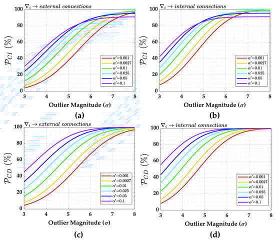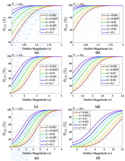 We emphasize that the probability levels associated with IDS in the presence of an outlier were analysed as a function of the user-defined Type I decision error (), outlier magnitude (), correlation between test statistics () and reliability indicators (i.e., redundancy number and reliability number ). It is important to highlight that these probability levels are based on critical values that were optimized via Monte Carlo.