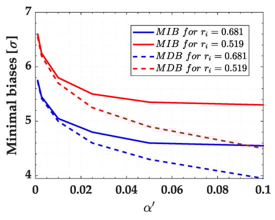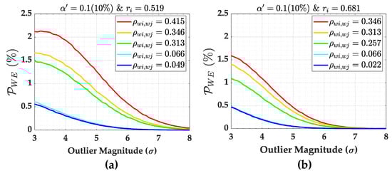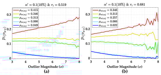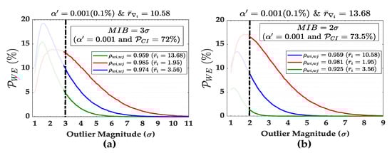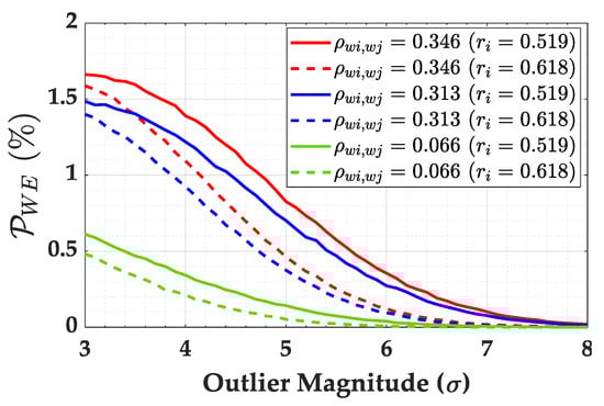- We also observe that it is possible to find the value of the MIB when the contributions of each measurement to the probability of wrong exclusion start to decline simultaneously. In that case, the identifiability of a given outlier can be verified for a given and . In other words, for a certain outlier magnitude, the effect of the correlation between test statistics becomes insignificant, which increases the probability of identification. Moreover, if a small outlier magnitude (outlier with a magnitude close to the measurement uncertainty) were to arise for a measurement system with a high correlation between test statistics, the alternative hypotheses would not be distinguished; i.e., this outlier would never be identified.