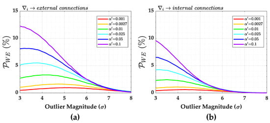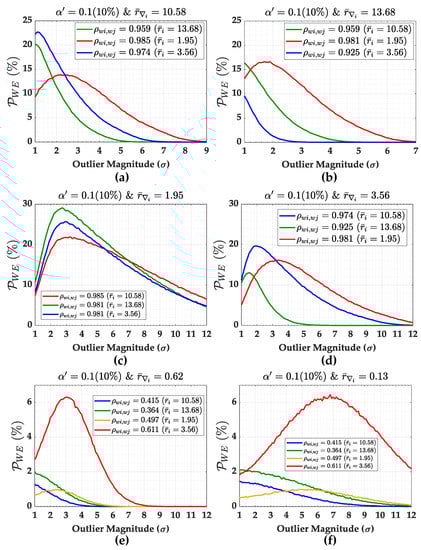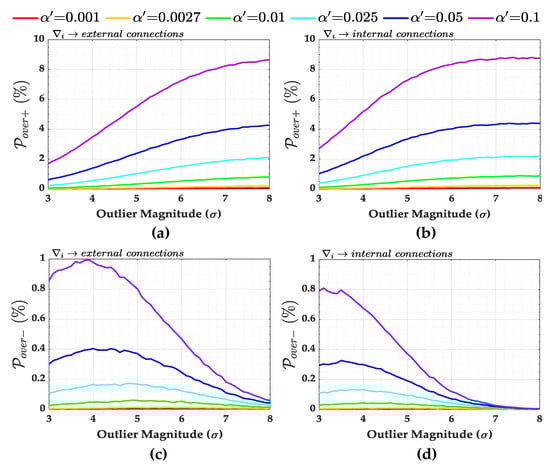 - The larger the Type I error (), the higher the probability of correct outlier identification (). However, it is valid only to a certain limit of outlier magnitude (threshold). There is an inversion when the outlier magnitude is greater than this threshold: i.e., the larger the , the lower the . This is more critical in the case of a measurement system with a high correlation between test statistics. Moreover, the Type I decision error restricts the maximum rate of .