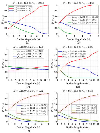 Moreover, herein, a new class of decision is taken into account when IDS is performed, which corresponds to the probability of simultaneously flagging two (or more) measurements as outliers. We call this the probability of “statistical overlap” (). This means that occurs in cases in which one alternative hypothesis has the same distribution as another one. In other words, these hypotheses cannot be distinguished; i.e., they are nonseparable, and an outlier cannot be identified [].