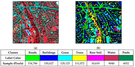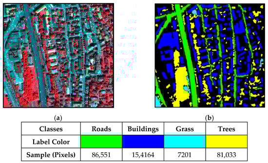 Experiments in this work were conducted on two VHR remotely sensed imageries acquired by the QuickBird satellite covering an urban area in Zurich, Switzerland, in August 2002. Zurich Dataset 1 and Zurich Dataset 2 (denoted as “Zh1” and “Zh2” in the following sections) had a size of 833×881 pixels and 1025×1112 pixels, respectively. The Gram–Schmidt (G-S) pan-sharpening fusing operation was performed to combine the panchromatic and multispectral bands to generate four fused bands (visible red, green, blue, and also, near-infrared) having a spatial resolution of approximately 0.62 meters. For more details about the Zurich dataset, the reader can refer to https://sites.google.com/site/michelevolpiresearch/data/zurich-dataset. Four land-cover types including buildings, grass, trees, and roads in Zh1 and seven classes (i.e., trees, buildings, roads, grass, bare soil, water, and pool) in Zh2 are available in the reference maps. Figure 1a and Figure 2a show the images of two datasets and the corresponding available reference maps. Training and testing samples used in the experiments are provided in detail in Table 1, where 1% and 0.5% of the whole available samples were used as training samples and the rest for testing on the two datasets, respectively.