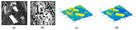An example of the guided filtered result based on the QuickBird images: (a) input image I; (b) the guidance image G; 3D comparison of band features: (c) before and (d) after GF.