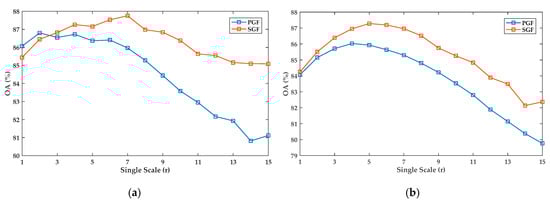 By visual comparison of the features extracted by the pixel-level guided filter (PGF) and SGF (both with the scale of r = 6) in Zh1 (as shown in Figure 7), we can find that the spectral-spatial information was better preserved in the SGF feature (Figure 7b) than that of PGF (Figure 7a). Figure 8 shows the comparison of the classification accuracies obtained on PGF and SGF features at single scales on two datasets. In the experiment of Zh1, one can see that in Figure 8a, the proposed SGF outperformed the original PGF with overall higher OA values, where the highest OA value was equal to 87.75% when r = 7 and 86.80% when r = 2 in two compared approaches, respectively. Moreover, by increasing r, the accuracy of the PGF decreased more significantly, whereas the proposed SGF achieved a gentler descending trend. This confirmed the effectiveness of the proposed superpixel-based approach, which generated single-level features having better representative potential for the complex image objects. Experimental results obtained on Zh2 (as shown in Figure 8b) also indicated the effectiveness of the superpixel-level guidance image. The highest OA obtained by SGF was 87.28% when r = 5, which was higher than the one obtained by PGF with an increase of OA equal to 1.25%.