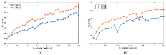 Performance comparison for multiple scales’ classification between the proposed MSGF and the reference MPGF techniques obtained on: (a) Zh1 and (b) Zh2.