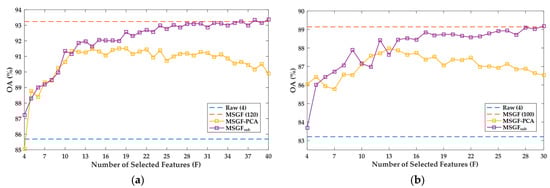 To analyze the influence of selected feature number F for the final classification performance, classification was implemented based on different selected MSGFsub with F ranging from T (i.e., the original image bands) to 1/3 of T × R (i.e., the number of total features in MSGF). Therefore, the final numbers were: F = [4,40] in Zh1 and F = [4,30] in Zh2, respectively.