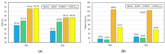 In this subsection, additional statistics were done by combining each step of the proposed FS-MSGF method. Four classification results were compared based on (1) the raw image, (2) features extracted under the single scale (i.e., SGF), (3) multi-scale stacked features (i.e., MSGF), and (4) the proposed FS-MSGF. Figure 13 is the analysis of OA values and the time efficiency of each step. Note that the analysis was based on the result of SGF and MSGFsub. It is easy to find that in Figure 13a, each step in the proposed method had a positive influence on the final classification output. As one can see from Figure 13b, the time consumption increased dramatically with the step of high-dimensional multi-scale feature stacking and obviously decreased through the process of feature selection.