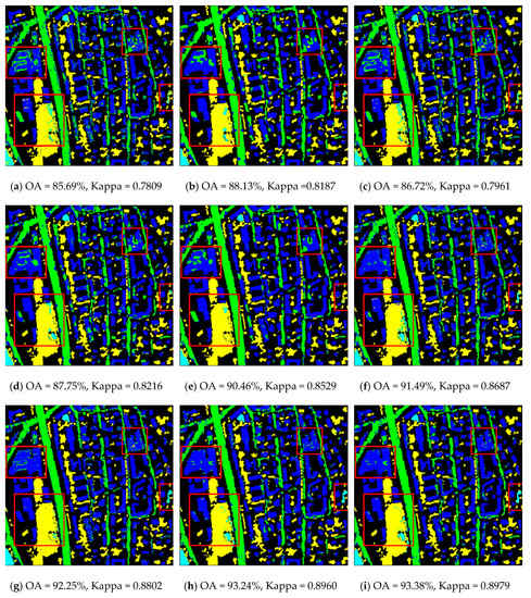 Classification maps (and the close-up figures in the red boxes) obtained by: (a) original bands; (b) SLICRaw (when S = 15); (c) PGF (with r = 4); (d) SGF (with r = 5); (e) GFProb (with r = 6); (f) MPGF (with r = [1,25]); (g) EMPs (with r = [1,25]); (h) the proposed MSGF (with r = [1,25]); (i) the proposed FS-MSGF (with r = [1,25] and F = 30) (Zh2).