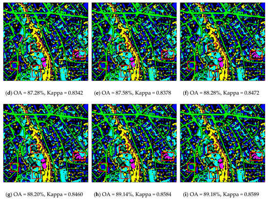 Classification maps obtained by: (a) original bands; (b) SLICRaw (when S = 15); (c) PGF (with r = 2); (d) SGF (with r = 7); (e) GFProb (with r = 14); (f) MPGF (with r = [1,30]); (g) extended morphological profiles (EMPs) (with r = [1,30]); (h) the proposed MSGF (with r = [1,30]); (i) the proposed FS-MSGF (with r = [1,30] and F = 40) (Zh1).