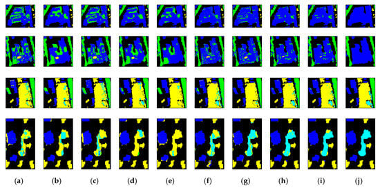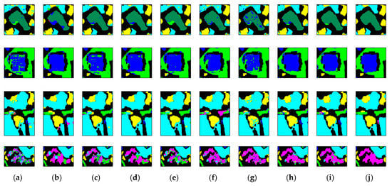 Comparison of local classification results obtained by: (a) original bands; (b) SLICRaw (when S = 15); (c) PGF (with r = 4); (d) SGF (with r = 5); (e) GFProb (with r = 6); (f) MPGF (with r = [1,25]); (g) EMPs (with r = [1,25]); (h) the proposed MSGF (with r = [1,25]); (i) the proposed FS-MSGF (with r = [1,25] and F = 30); (j) the reference map, where four rows correspond to four sub-regions highlighted in Figure 15 (Zh2).