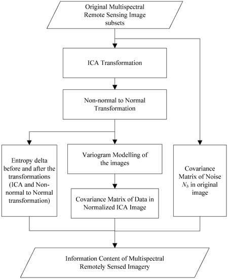 A flowchart is presented in Figure 1. As shown in Figure 1, first, ICA transform is conducted to decompose the original (multispectral) images into images with independent bands. This is done separately for each of the original images. Second, normal transform is carried out to obtain ICA- and normal-transformed images. Before doing this, normality test is needed to check the non-normality of the individual ICA bands. This is also done separately for each band of each ICA-transformed image. Third, for each band in each of the ICA- and normal-transformed (i.e., double-transformed) images, variogram modelling is performed so that covariance matrices corresponding to the individual double-transformed image bands can be built with estimated variogram model parameters. Finally, information content in individual bands of the double-transformed image can be computed (by taking advantages of multivariate normal distributions) with spectral and spatial dependences accounted for. Joint entropy of the original multispectral image can be estimated based on Equations (5) and (8), with mutual information estimated using Equation (10).