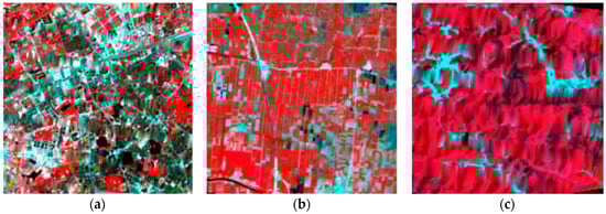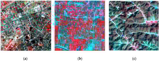 Specifically, the three Landsat ETM+ image subsets were selected from a Landsat ETM+ image (path and row number P123R39), flown over Wuhan City and surrounding areas, Hubei Province, China, on April 29, 2017. In these Landsat ETM+ image subsets (shown in Figure 3), bands 1–5 and 7 were actually used in the experiment, with band 6 excluded due to its different spatial resolution. The three Landsat TM image subsets were selected from a Landsat TM image (again, path and row number P123R39) acquired on March 14, 2009, as shown in Figure 4. Again, in these Landsat TM image subsets (shown in Figure 4a–c, respectively), bands 1–5 and 7 with the same 30 m spatial resolution were actually used.