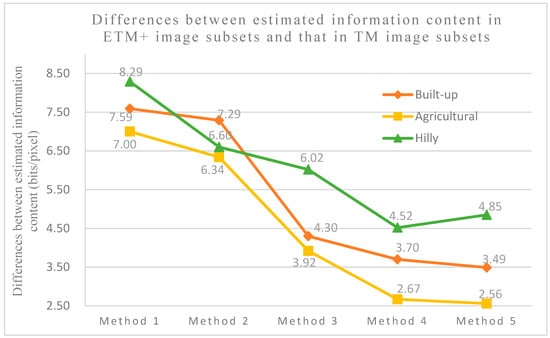 In order to clearly visualize the differences in information content between Landsat ETM+ and TM image subsets, three bar charts are presented in Figure 5. As shown in Figure 5, for all three different land cover types, information content estimates for Landsat ETM+ image subsets are consistently greater than those for Landsat TM image subsets. The differences in information content estimates between the two sensors are calculated and shown in Figure 6 for convenience.