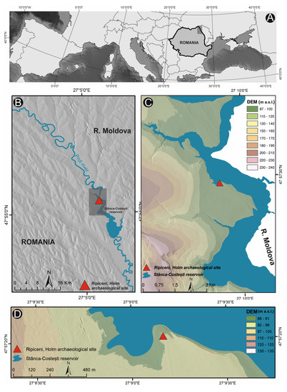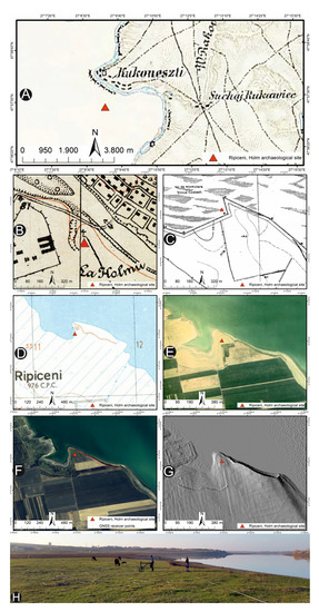 - Boghian, D.; Enea, S.C.; Pîrnău, R.G.; Melniciuc, A.; Asăndulesei, A.; Tencariu, F.A. Încercare de reconstituire a evoluției peisajului preistoric în Depresiunea Prutului Mijlociu, microzona sitului cucutenian de la Ripiceni—Holm, jud. Botoșani (partea II). In Arheovest IV2—In honorem Adrian Bejan—Interdisciplinaritate în Arheologie și Istorie; Micle, D., Ed.; JATEPress Kiadó: Szeged, Hungary, 2016; Volume IV, pp. 561–590. [Google Scholar]