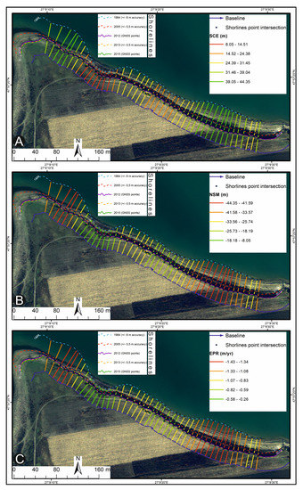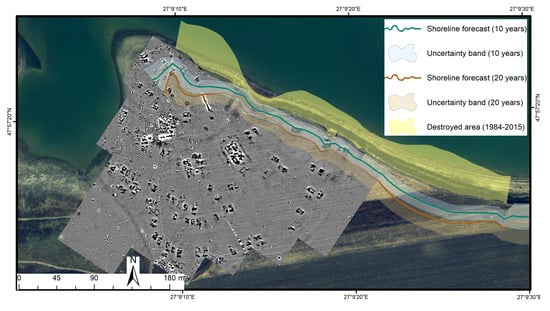 - Himmelstoss, E.A.; Henderson, R.E.; Kratzmann, M.G.; Farris, A.S. Digital Shoreline Analysis System (DSAS) version 5.0 user guide. In U.S. Geological Survey Open-File Report 2018-1179; U.S. Geological Survey: Reston, VA, USA, 2018. [Google Scholar] [CrossRef]
