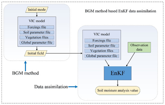 In this study, we propose an EnKF data assimilation framework based on the BGM method. It is experimentally proven that the BGM method could effectively generate the data assimilation initial field, perturbation error term w, and improve the estimation accuracy of the data assimilation of soil moisture. In future research, we plan to extend the EnKF data assimilation framework based on the BGM method in the following ways: (1) discuss the influence of the framework on the unbiased of the EnKF state estimator. (2) evaluate whether the BGM method is applicable to data assimilation on a global scale and (3) analyze the applicability of the BGM method to other Kalman filter data assimilation methods.