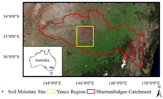 The Australian Murrumbidgee basin is located in southeastern Australia with a drainage area of 84,000 km2, and the study area is located Yanco, in the heart of the Murrumbidgee basin (34.5–35. 5° S, 145.5–146.5° E), with an area of 60 km × 60 km (Figure 3). The Yanco area is flat, with few woody vegetation in the study area: rice and barley crops in the west, drought crops in the north, and pastures in the southeast [46]. The annual precipitation in the Yanco region is about 500 mm. The Average Class A pan evaporation varies from less than 1500 mm/year in the southeast to over 2100 mm/year in the west, and this area of arid and semi-humid climates is of particular research value. The OzNet hydrological monitoring network has set up a total of 13 OzNet profiles, widely distributed at various points in the study area to measure the soil moisture. The system observes the soil moisture every 20 min. The daily surface (0–5 cm) soil moisture data obtained were used as verification data to evaluate the data assimilation results.