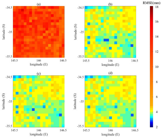 The root mean square error (RMSE) values between the CCI data and: (a) VIC simulation; the BGM method using the breeding lengths of (b) 24 h; (c) 48 h; and (d) 72 h.