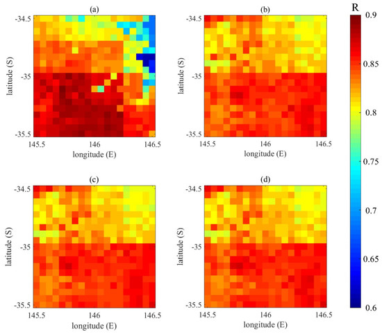 The different correlation coefficient (R) values between the CCI data and: (a) VIC simulation; the BGM method using the breeding lengths of (b) 24 h; (c) 48 h; and (d) 72 h.