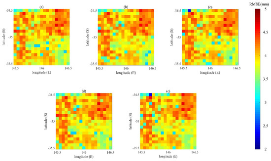 The RMSE values between the CCI data and the assimilated data with ensemble sizes of: (a) 20; (b) 50; (c) 100; (d) 200; and (e) 500.