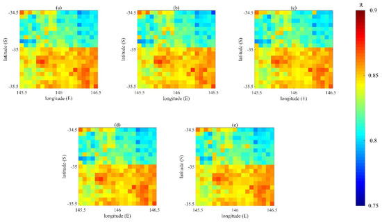 The R values between the CCI data and the assimilated data with ensemble sizes of: (a) 20; (b) 50; (c) 100; (d) 200; and (e) 500.
