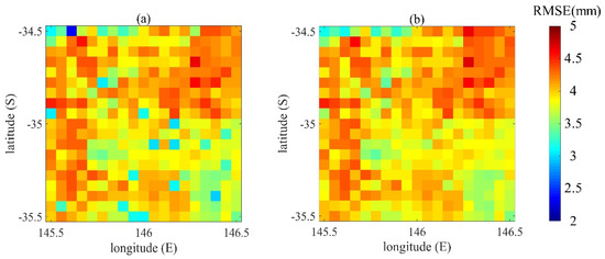 The RMSE between the CCI data and assimilated data using: (a) the BGM method; and (b) the Monte Carlo (MC) method.
