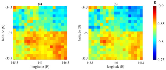 The R between the CCI data and assimilated data using: (a) the BGM method; and (b) the MC method.