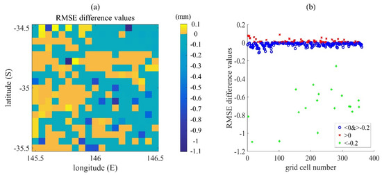 The blue area shows negative values and the yellow area shows positive values. The number of grids in the blue region is 248, accounting for 68.7% of the total number of grids. The minimum value in the blue region is –1.0952 mm, which proves that the RMSE of the BGM method is smaller than the RMSE of the MC method by 1.0952 mm. The number of grids in the yellow area is 113, accounting for 31.3% of the total grid number and the maximum value of the yellow area is 0.0885, which proves that the RMSE of the MC method is smaller than the RMSE of the BGM method by 0.0885 mm. In Figure 10b, the red point is positive and the blue and green points are negative. Most of the points are distributed around the value of 0, where there are more blue points than red, which proves that the BGM method is better than the MC method in most of the grids. The green dot represents a grid point with δRMSE < –0.2 mm and has a total of 19 grid points, accounting for about 0.05% of the total grid points. These points represent a significant improvement in the data assimilation ability of the BGM method compared with the MC method. It is proved by experiments that the BGM method is better than the MC method in data assimilation perturbation and could improve the accuracy of the data assimilation for soil moisture estimation.