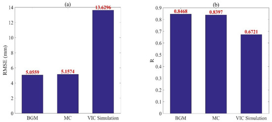 The RMSE (a) and R (b) of the data assimilation using the BGM method, the MC method and the VIC simulation experiments.
