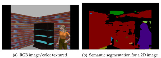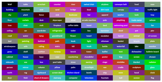 - Semantic SegmentationThe deep neural network pyramid scene parsing network (PSPNet) based on semantic segmentation [28] is employed to provide semantic segments for the different objects in 2D images. The network architecture is shown in Figure 2. PSPNet operates in five steps as follows: (i) create a feature map using resnet, (ii) apply pyramid pooling on the created feature map to produce feature maps at varying resolutions, (iii) perform convolution on each pooled feature map, (iv) create a final feature map by upsampling the feature maps and concatenate them, and (v) generate a class score map by employing final convolutions.The PSPNet model is trained [28] on two datasets, the SUNRGB [38] and ADE20K [39]. The ADE20K dataset includes a large vocabulary of 150 classes from both indoor and outdoor objects. However, the SUNRGBD data set contains 38 semantic classes for indoor scenes. The fact that the ADE20K dataset contains a larger number of objects made it a preferable choice to segment an unknown environment with a diversity of objects. Examples of 2D images with semantic segments are shown in Figure 3a,b respectively. The RGB images are obtained using the simulated sensor in the Gazebo simulator that mimics the characteristics of an actual camera. In this work, only ADE20K dataset is used and the semantic labels of ADE20K dataset are shown in Figure 4.