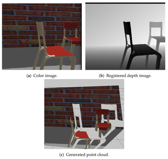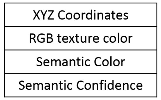 - Semantic FusionSemantic information encapsulated in the point cloud is fused using the “max fusion” approach [40]. In the max fusion approach, the semantic color that corresponds to the highest confidence value generated from the CNN model is included in the generated point cloud. In addition, the same value of the confidence and the label color are saved in the corresponding voxel of octomap.