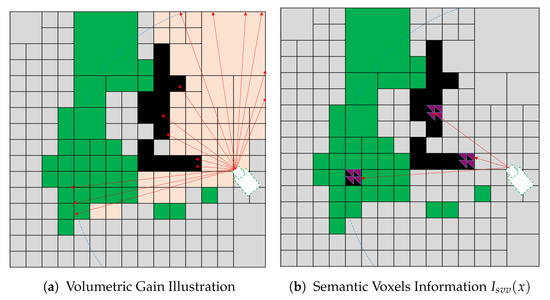 - Semantic Visible Voxel (SVV)The proposed SVV multi-objective function tends to direct the robot towards the views that contain known occupied voxels with a small confidence value to label all the objects in the scene. The confidence value is obtained from CNN, and it is the maximum confidence value for the corresponding class out of 150 objects. Let be the indicator if the semantic confidence value assigned to a voxel is less than a predefined threshold:where is the semantic confidence value fused by the deep learning model, and is a predefined confidence threshold.We propose semantic information for a single voxel as a voxel that is visible, semantically labeled, and its confidence value less than a predefined threshold. The is defined as:Finally, the gain obtained from the proposed utility function is calculated by substituting into in Equation (1), where and . The total gain for a single view combines the volumetric and semantic info for all the voxels in the view. Figure 10 illustrates the SVV function which is a combination(accumulation) of both the volumetric in formation in Figure 10a and semantic information in Figure 10b.