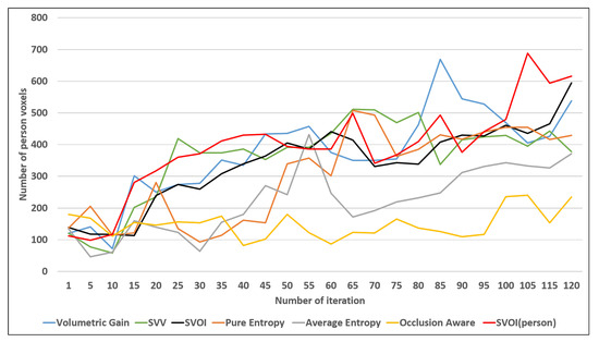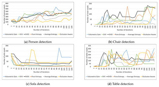 - Semantic Visited Object Of Interest Visible Voxel (SVOI)The proposed SVOI multi-objective function tends to direct the robot toward the views that contain occupied voxels classified as an object of interest but not visited sufficiently. In this function, the number of visits for each voxel is recorded to be used in the semantic information calculation. Let be the indicator if the object belongs to the set of interest object S as follows:Each voxel in the semantic map holds a value that represents the number of times it has been visited. In addition, let be the indicator of visiting threshold:where is a predefined threshold for the sufficient number of visiting.We propose semantic information for a single voxel as a voxel that visible voxels, semantically labeled, belongs to object of interest, and their visiting value is less than a predefined threshold. It is defined as:Finally, the gain obtained from the proposed utility function is calculated by substituting into in Equation (1) where and . The total gain for a single view combines the volumetric and semantic info for all the voxels in the view.
