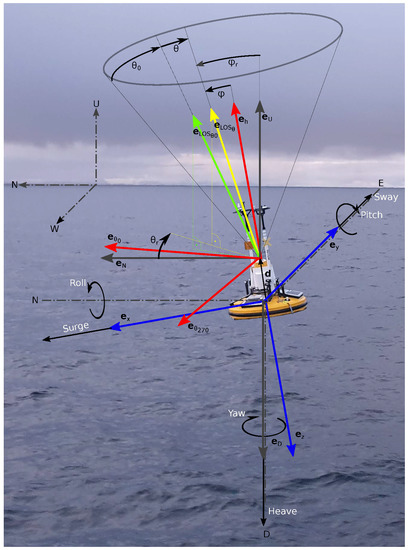 The selection of the unit vectors , , and where the subscript stands for “down” corresponds to the orientation of the velocity data , , and , as defined in the setup of the MRU. The terms for the influence of roll and pitch angular velocity and on the translational velocity are sufficient when the distance vector is oriented along the z-axis of the MRU. If contains non-zero elements for the first or second coordinate, a third term for azimuthal rotation is required.