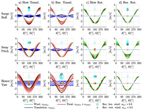 Oscillatory motion with a low frequency affects the wind component of the same orientation; i.e., the surge and sway components of motion and influence the horizontal wind speed components and ; heave velocity influences the vertical wind speed . Figure 2a shows this effect of translational motion. The figure shows line-of-sight velocities of a VAD scanning lidar on the y-axis plotted against the azimuth angle of the lidar beam on the x-axis. In all plots, the wind direction is assumed to be aligned with the heading of the lidar so that . The wind velocity is . We also define that surge motion occurs with an arbitrary amplitude of along the wind direction. Sway and heave have the same amplitude and are directed perpendicularly to the wind direction. The figure visualizes the lidar-measured LOS velocities in three ways: contribution of the wind, the lidar’s motion, and combined. The green lines represent the contribution of the wind to the line-of-sight measurement as if it were to be measured by a lidar without any translational motion. It has a cosine shape with peaks in the upward and downwind directions. The contribution of the translational motion on the line-of-sight velocities is visualized by the blue lines of varying darkness. The red lines show the sum of both contributions. We ignore that the lidar used in this study cannot detect the sign of the radial velocities. We therefore show the results of the wind vector reconstruction based on the absolute line-of-sight velocities according to Equations (20) and (21) as markers: cyan colored circle markers show the reconstructed horizontal wind speeds and brown cross markers show the reconstructed vertical wind speeds. Their location on the x-axis represents the reconstructed wind direction. It can be seen in Figure 2a that e.g., a slow back and forth motion in the wind direction (first row: surge) is detected in the same way as horizontal wind fluctuations; sideways motion (second row: sway) is perceived as transversal wind; and up and down motion (third row: heave) leads to a change of radial velocities in all line-of-sight directions. We see as expected that surge motion influences the horizontal wind speed ; sway motion influences the wind direction ; and heave motion leads exclusively to variation of the vertical wind speed component .