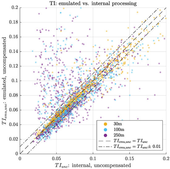Comparison of turbulence intensity () estimates based on wind data time series from internal data processing vs. emulated data processing. Only three height levels shown for clarity. The dashed-dotted lines limit a interval parallel to the dashed line.