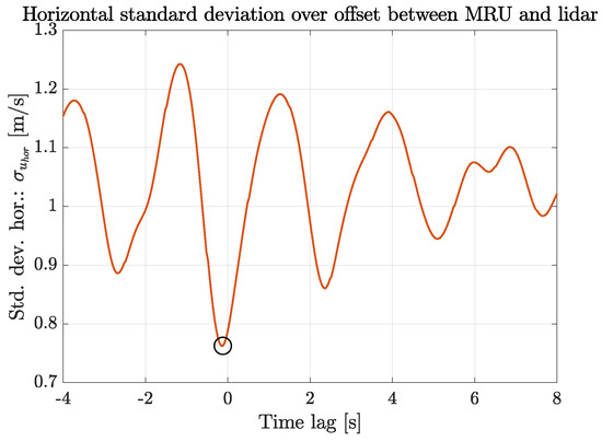 Standard deviation of the motion compensated horizontal wind speed as a function of timing offset between MRU and lidar data. is the mean of all height levels for one arbitrary ten-minute interval. The absolute minimum at indicates the sweet spot that corresponds to the real offset between the two datasets.