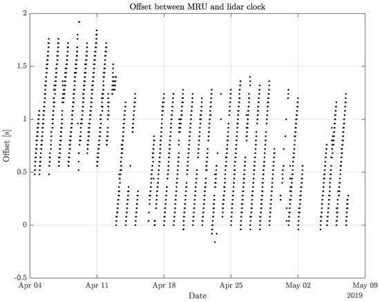 We know of several sources of error that might lead to uncertainties in our results. During the process of synchronizing the MRU and lidar data, we choose a time step of in order to find a good compromise between precision and computation time. For that reason, we expect that the sweet spots shown in Figure 5 are on average away from the correct values. In Figure 4 we see that the resulting error has approximately a cosine shape with an average period of . We therefore expect only a small statistical error of of the motion-induced due to this timing error.