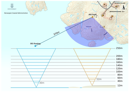 Map indicating the location of the floating lidar unit 593 and the land-based fixed reference lidar unit 495. The elevation difference above sea level and the geometry of the measurement cones is shown for all measurement heights. The selected offshore wind sector is indicated in dark blue. (Map data adapted from www.kartverket.no).