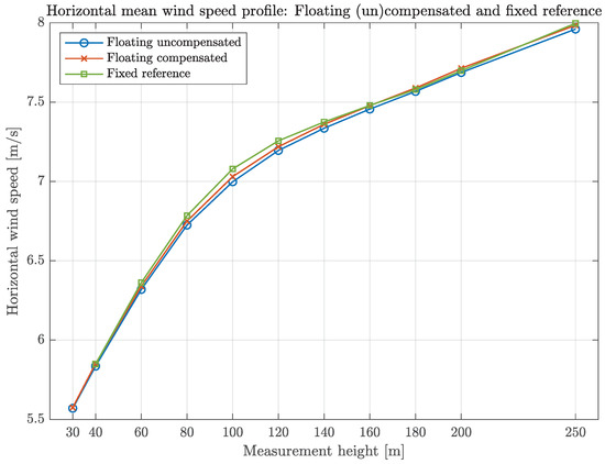 Average of measured horizontal mean wind velocities from the floating lidar with (red) and without (blue) motion compensation, as well as from the fixed reference lidar (green), sorted by measurement height.