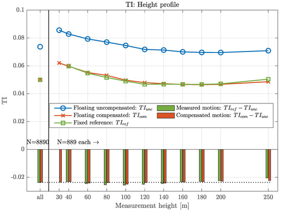The floating lidar without any compensation measures a mean . The shape of the profile is similar to the reference profile, but all values are on average approximately higher due to motion-induced turbulence. The motion compensation reduces the estimates to a level of , which is very close to the reference value and equals a motion reduction factor of 99.8%. Overall, the profile follows the profile. The bar plots in Figure 8 visualize the amount of motion-induced in two ways: first, we present the difference between the uncompensated floating and fixed measurements (green); second, we show the amount of motion-induced detected by the algorithm (red), which is the difference between uncompensated floating and compensated floating . Each pair of bars would have the same length if the motion compensation algorithm were perfect and the measurements from both locations were fully comparable.